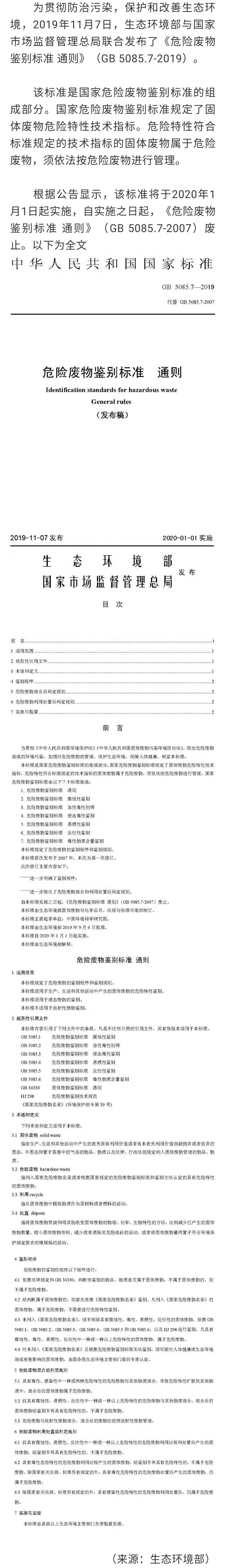 新《危險廢物鑒別標(biāo)準(zhǔn)通則》公布2020年1月1日實施